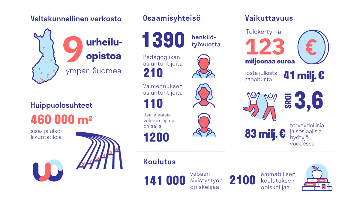 Urheiluopistoverkostoon kuuluu yhdeksän urheiluopistoa. Pedagoginen osaaminen, olosuhteet ja resurssit tekevät urheiluopistoverkostosta Suomen suurimman liikunnan ja urheilun osaamiskeskittymän.